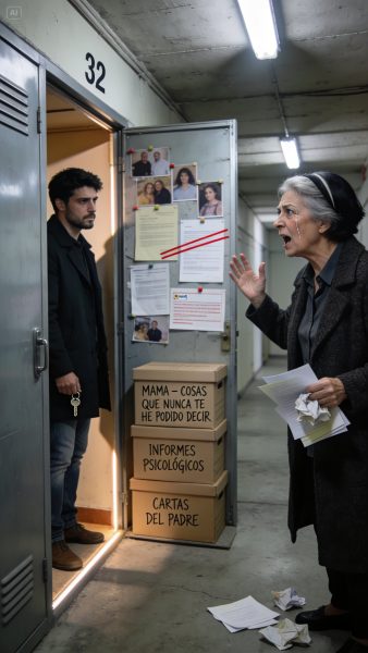 El pasillo de los trasteros olía a humedad y lejía barata. Mi trastero es el 14; siempre ha sido. Pero el 32 estaba al fondo, en una esquina donde casi nunca había pasado. La puerta de chapa tenía un candado nuevo. La llave entró con facilidad. Mientras la giraba sentí, por primera vez en mucho tiempo, algo parecido al miedo. Levanté la persiana metálica, encendí la luz del techo y me quedé helada. Las paredes estaban cubiertas de fotos mías y de Alejandro, papeles, informes, palabras subrayadas en rojo. Y en la caja más cercana, en letras grandes, leí: “MAMÁ – COSAS QUE NUNCA TE HE PODIDO DECIR”.