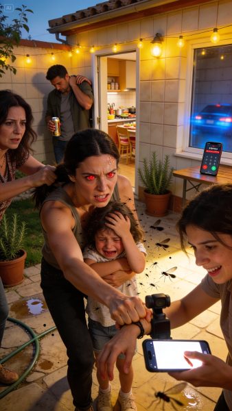 Estábamos en casa de mis suegros cuando mi cuñada se llevó a mi hija de 4 años afuera, sonriendo: “Quiero probar algo divertido”. Pasaron minutos… y escuché gritos que me congelaron la sangre. Corrí y encontré a mi niña atrapada, llorando, rodeada de un enjambre, mientras mi cuñada grababa riéndose como si fuera un experimento. Intenté correr hacia ella, pero mi suegra me jaló del cabello y me tiró al suelo: “Déjala, mi hija está feliz”. Miré a mi esposo buscando ayuda… y él solo encogió los hombros: “Que terminen”. En ese instante supe que mi matrimonio había muerto.