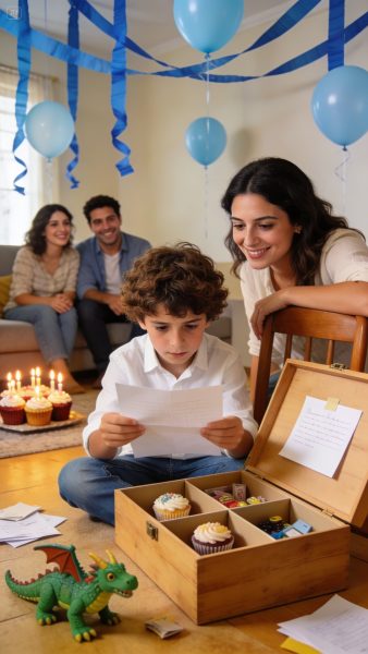 Cuando llegó el momento del último regalo, el salón ya estaba lleno de migas y risas. Damian hizo un gesto grandilocuente.