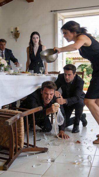 Todo ocurrió de golpe. El segundo vigilante intentó cerrarle el paso por la espalda. Viktor se volvió y empujó una silla con violencia. Daniel se lanzó a sujetarlo del brazo. Nadia gritó por fin. Un invitado tropezó. Varias personas echaron a correr. Yo vi la mano de Viktor bajar hacia el cinturón y no pensé: agarré una cubitera metálica de la mesa auxiliar y se la lancé con toda la fuerza que tenía.