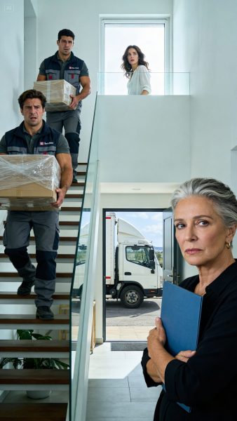 Chloe, que miró por la ventana con una taza en la mano, palideció de golpe al ver a cuatro operarios bajar cajas, precintos y un inventario en papel. Margaret salió de su habitación con el bolso colgado del brazo y la carpeta azul apretada contra el pecho.
