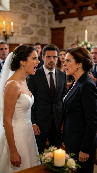 Entonces las puertas del fondo se abrieron con un golpe seco. Entró Mercedes Salcedo, mi futura suegra, impecable en un traje azul oscuro, sin una sola prisa en el paso. No venía alterada ni avergonzada. Venía con la serenidad cruel de quien sabe que tiene el control de una habitación. Se plantó en mitad del pasillo, me miró de frente y dijo con voz clara, para que la oyeran hasta los últimos bancos: